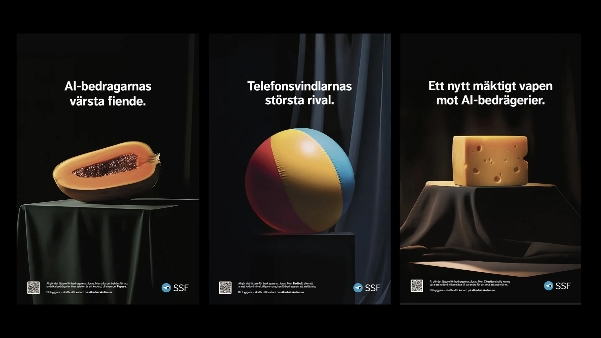 SSF (or Svenska Stöldskyddsföreningen) is a Swedish non-profit organisation created to prevent burglaries, robberies and now (of course) online identity theft. With a simple AI-voice-changer someone can call you and sound exactly like your grandma, simply asking for a little help. Or some money. Or a password. But there’s an very analog answer to this increasingly technical reality. Have a code word. Ask “what’s our code word“ and if they don’t answer with (for example) Papaya, Cheddar or Beach Ball they’ve failed the test and you can hang up. This campaign aims to raise awareness for SSF as an organisation and to show that there’s an easy solution for this complex, slightly dystopian future we’re heading into.